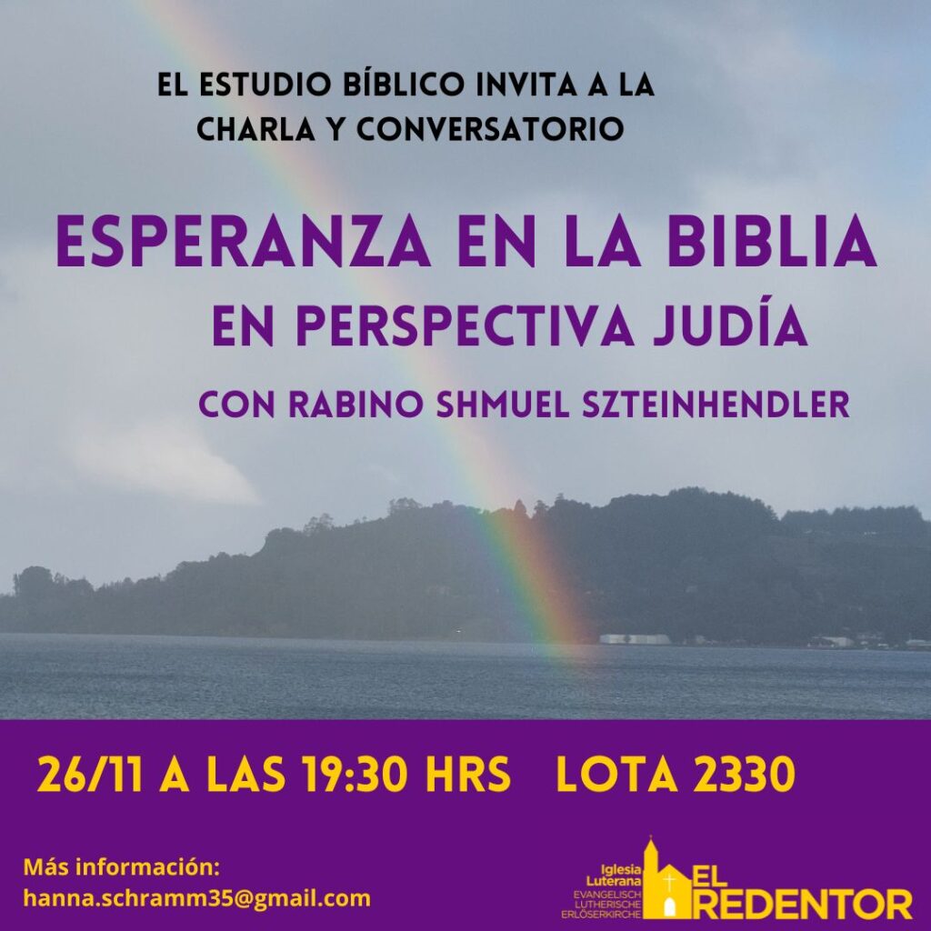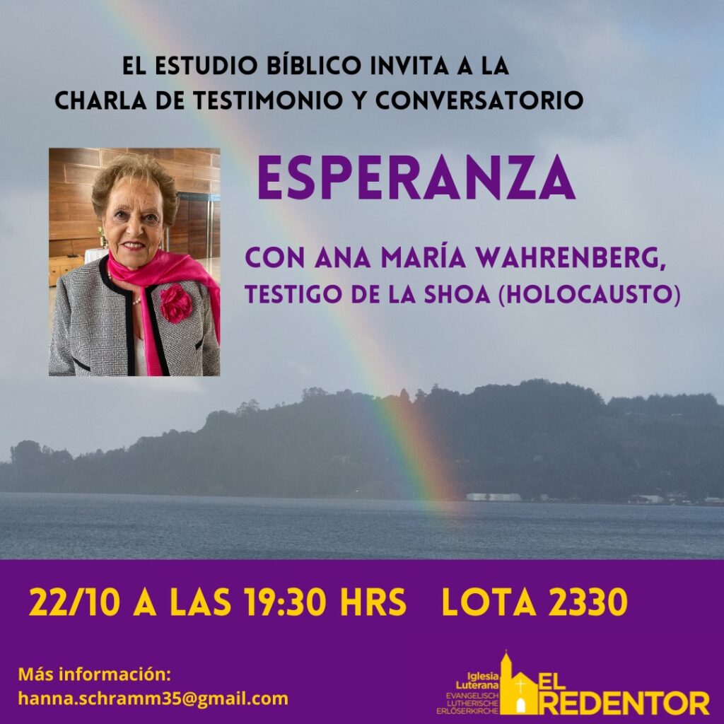 El estudio bíblico invita muy cordialmente a la charla de testimonio y conversatorio sobre Esperanza con Ana María Wahrenberg, testigo de la shoa (holocausto) el 22 de octubre a las 19:30 hrs en Lota […]